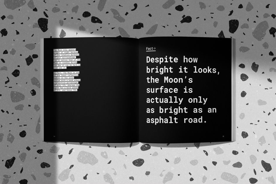 The project was also a chance for Tim to indulge in his love for the NASA aesthetic from the '60s and '70s. Each book comes packaged in an anti-static bag so it feels like space rations that the reader is taking to the Moon on their first trip. "I wanted the book to feel contemporary and well-designed, but also a bit fun. I also used a fixed-width typeface that's a throwback to the old control panels that NASA used to use."