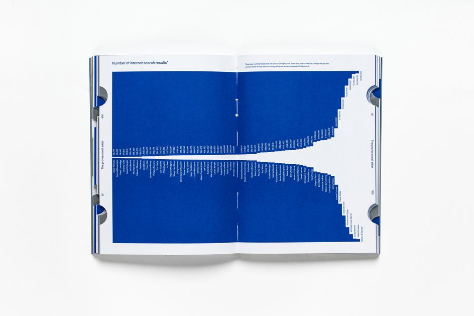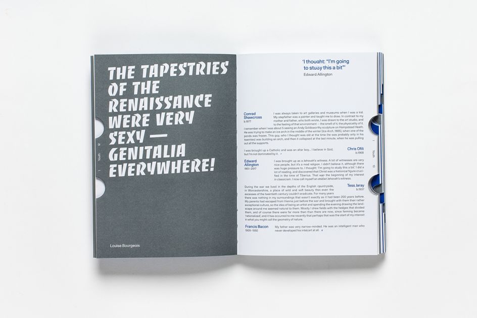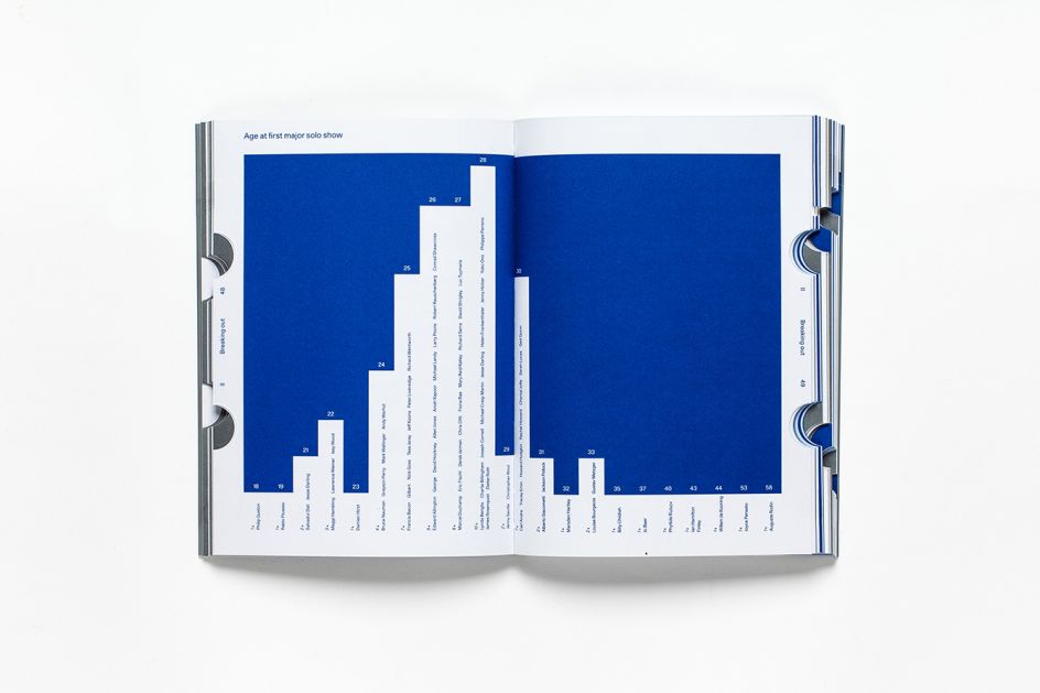 The compact paperback is a piece of art itself. Designed by Bibliothèque, it resembles an instruction manual and unusually for an art book, doesn’t contain any images. Instead it is typographically lead, set in Unica77, with the cover and feature pages set in slanted Banco, and uses bespoke infographics that chart facts about the featured artists. It is printed in two Pantone colours, 430 U Grey and 286 U Blue, with each of the book’s five chapters featuring two die-cut thumb tabs, traditionally used for dictionaries.