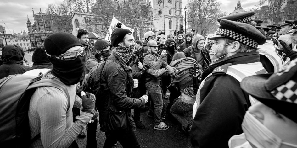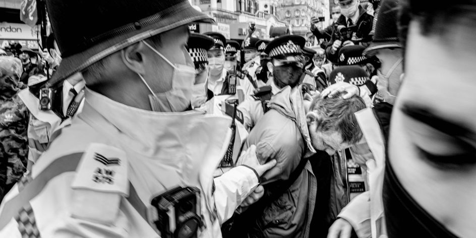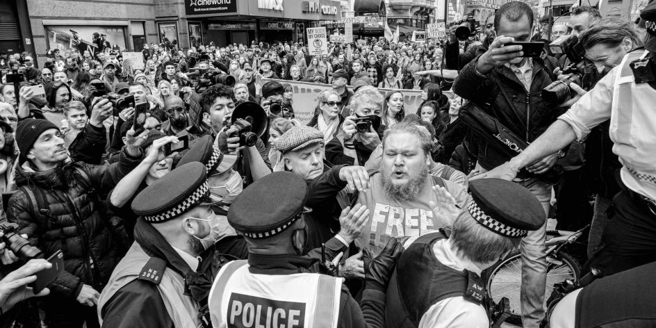 Jeremy says: "Between May 2020 and May 2021, I took photographs of more than 27 demonstrations across London. On some days, I photographed at more than one demonstration, moving between two or three merging events, making it hard to be precise about the number photographed.