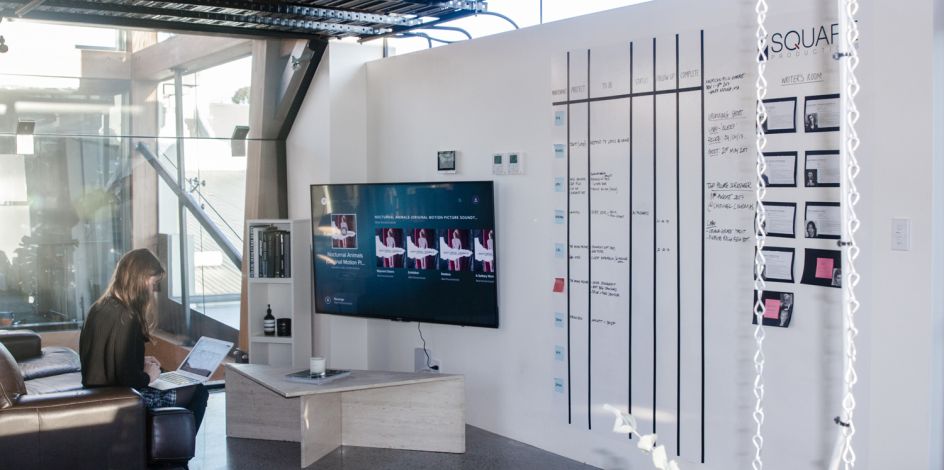 Our space has a modern industrial feel to it, particularly with the polished concrete flooring and wooden furnishings. The entire studio is enclosed in glass, which provides gorgeous views of the surrounding city. We have warehouse-style shelves filled with our collection of cinematic books, a whiteboard wall which we use to coordinate our upcoming projects, as well as a large flat-screen television for our client viewing area.